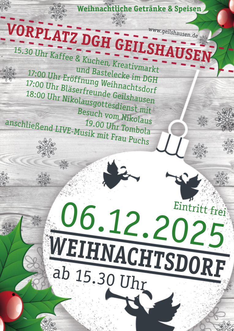 hiermit laden wir Euch am 7. Dezember in unser „Geilshäuser Weihnachtsdorf“ auf dem Vorplatz des DGH herzlichst ein.